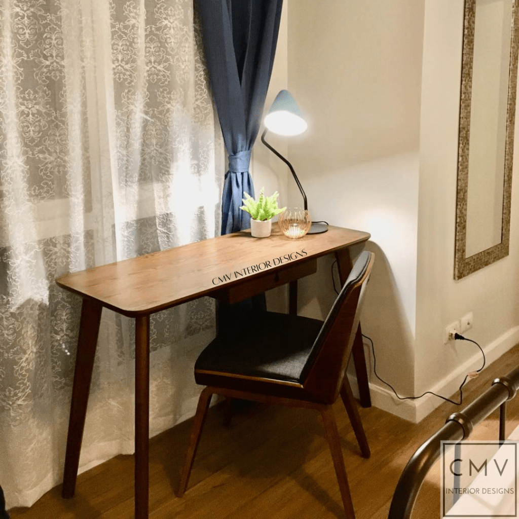 Nook; a secluded corner perfect for a small working space. Vibe up with a sleek wood table and a vintage leather chair complete the looks of elegance in pocketed space. Blending with a warm wood flooring and nude wall made the nook stood up. Drapery with a splash of blue tone, shading the space in the warm sun during the day and white sheer gives the silhouette of nightscape complete the perfect space for a working from home set up.