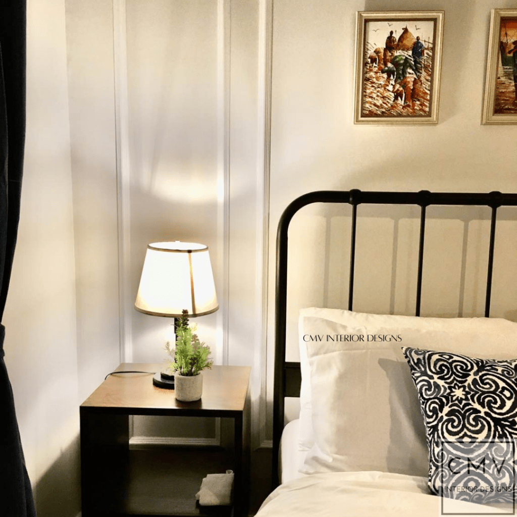 Subtle Muted; a perfect word to liberate space. With a black metal farmhouse bedframe, soft white crisp linen and molded white wall with a petite modern wood bedside table accessorized with mini table lamp and a dash of texture, accent with gold frame artwork on the walls, all you wish with this look is just a good night sleep on this comfy subtle bedroom.