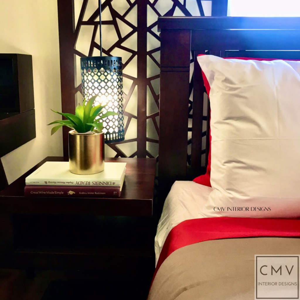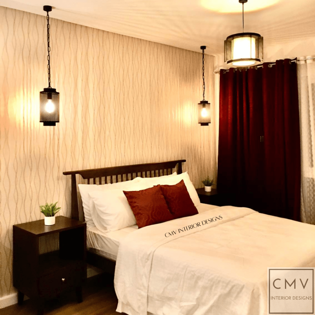 Deep Red! Says more on a room. Has a distinct impact on a good flow of energy, evokes a feeling of excitement on the subtle shade of the wall, ceiling, and linens. It blends perfectly on the dark wood tone of the furniture and flooring. Lighting fixtures dangling on the ceiling is a great accent on the room’s ambiance, emphasizing the room’s vibrancy.