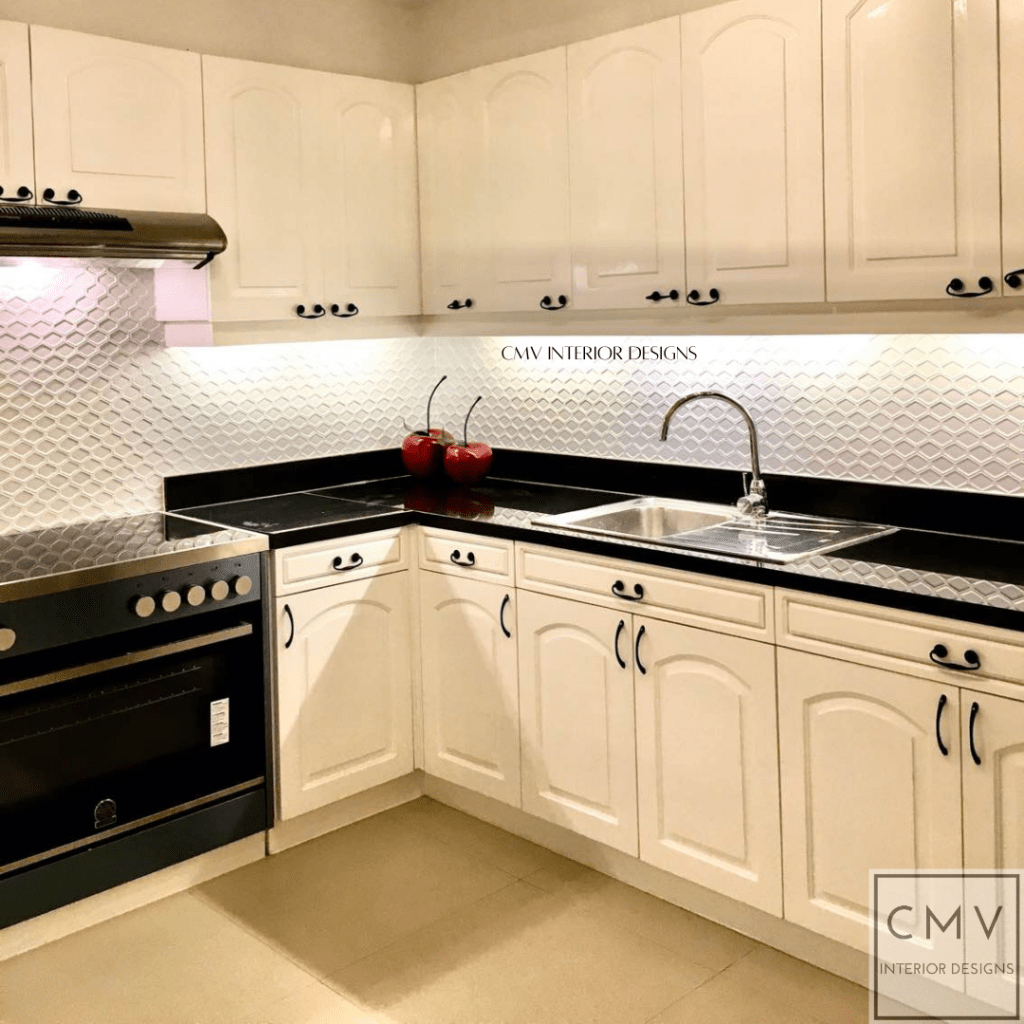“Black & White” – A sharp white cabinet color and smooth black line for countertop and cooktop make me want to sing along while cooking in this beautifully executed kitchen design. Enclosed cabinetry designs are suited superb to clutter-free and organize the kitchen. Mosaic backsplash adds textures to the whole looks and feels.