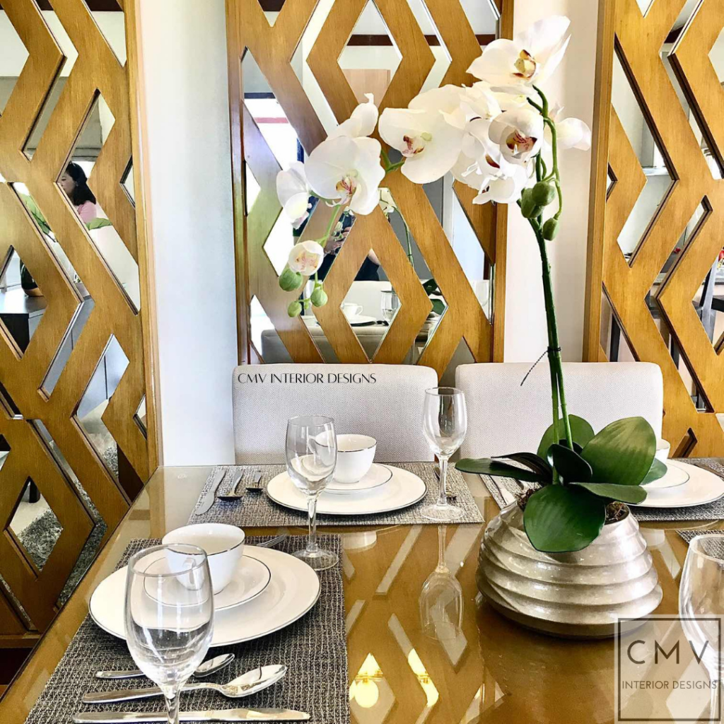 The intricate pattern of craftsmanship by use of wood paneling, vibes that fantastically bring out the plain wall to a hotel-like feel dining space. The use of a mirror in the background gives a certain dimension of a bigger space. The yellow ochre tone radiates a metallic feel of gold which brings out luxurious and expensive ambiance to this dining space. A little piece of fauna in the vase completes the look.