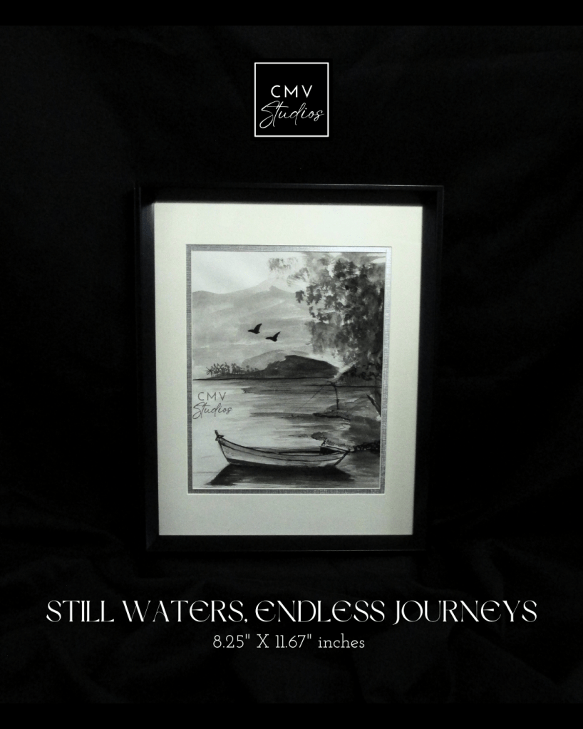 A lone boat rests upon the calm waters, while birds soar freely in the distance. This artwork captures the quiet beauty of reflection and the promise of new adventures, reminding us that stillness is just a pause before the next journey begins.