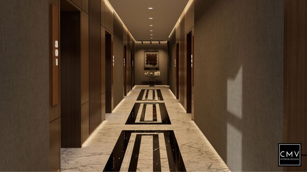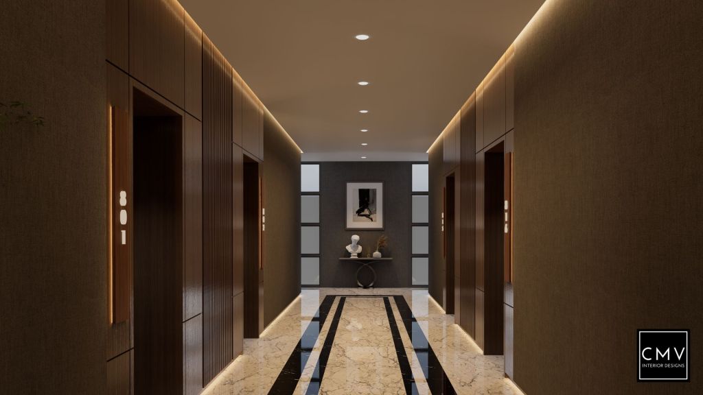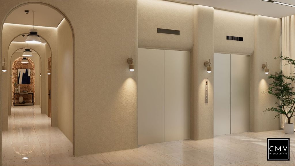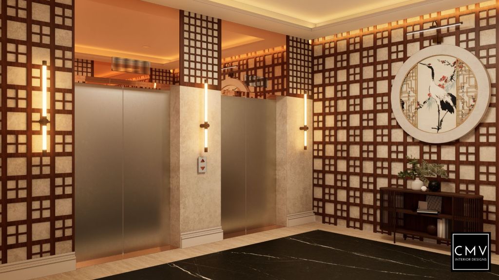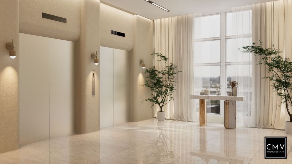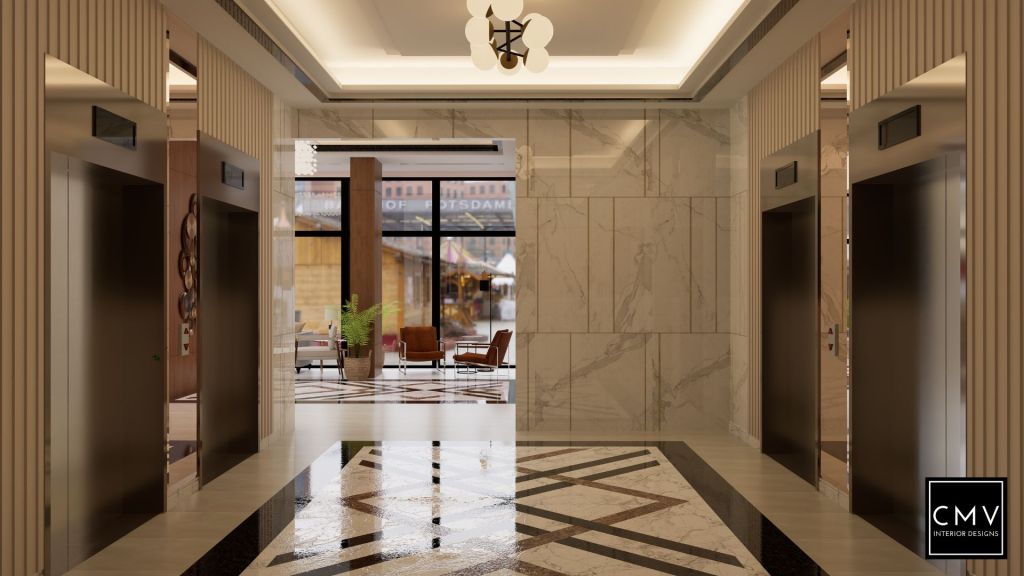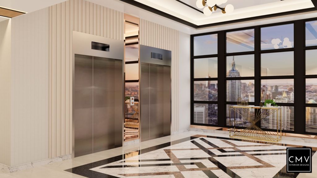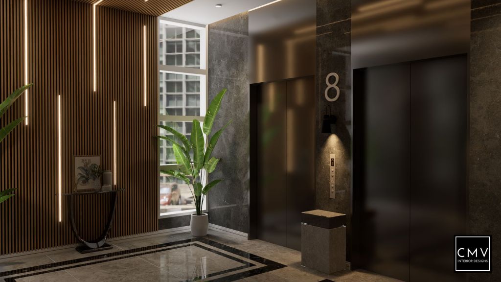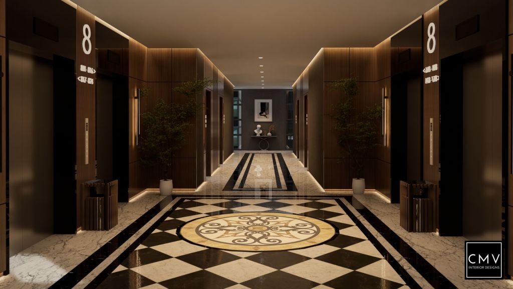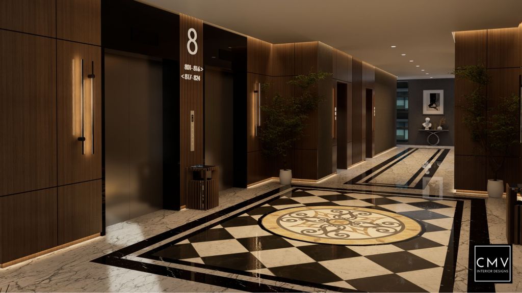 This high-end elevator lobby exemplifies refined luxury through the perfect harmony of modern finishes and classical detailing. The focal point is a striking black-and-white marble inlay floor with a regal medallion pattern that reflects ambient lighting for added depth and drama. Flanked by wooden paneling with vertical lighting, the sleek elevator doors seamlessly blend into the warm, contemporary walls. Decorative plants, minimalist furniture, and a curated artwork piece complete the space, making it not just a passage, but an experience of elegance.