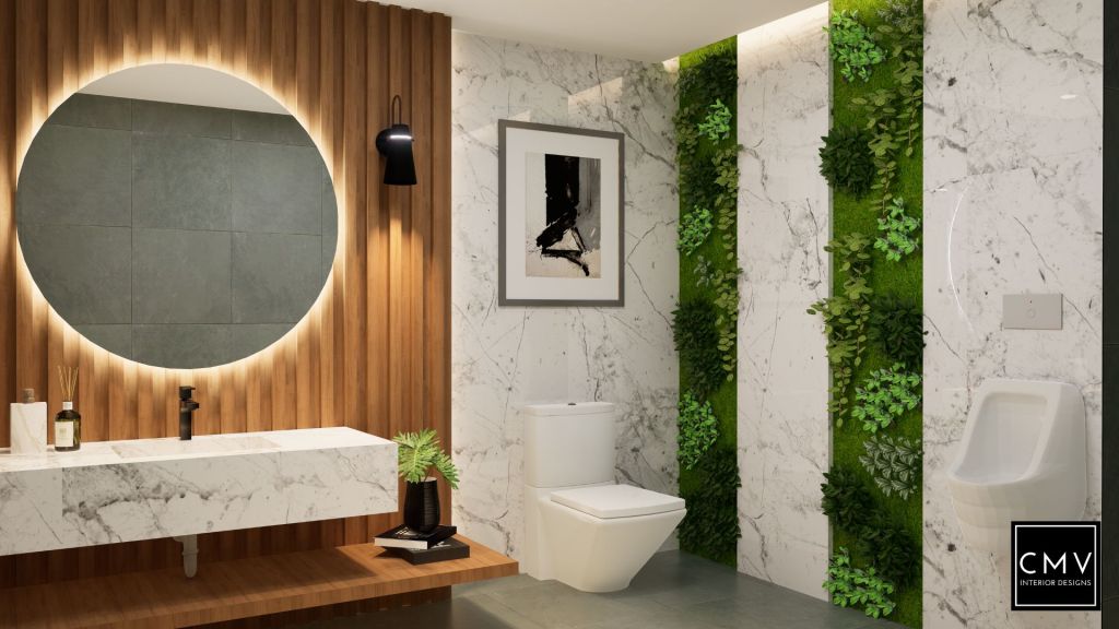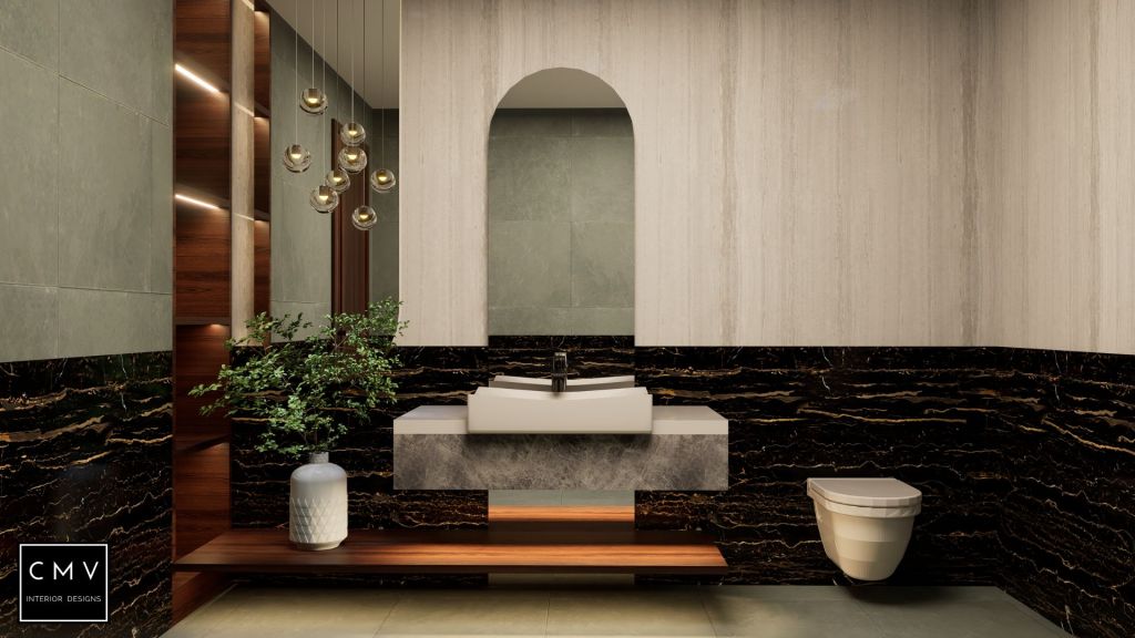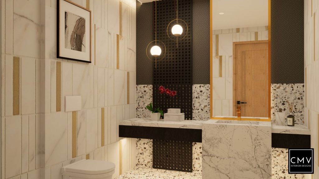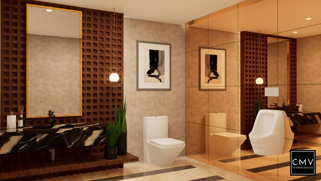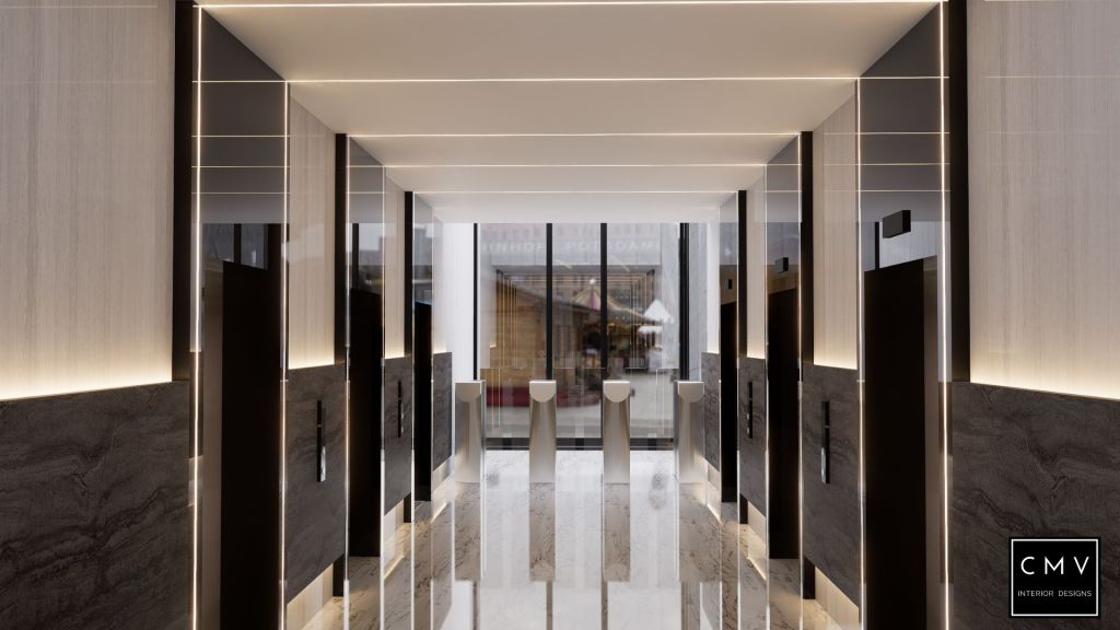 A luxurious yet warm environment creates a harmonious balance within the space. The combination of luxurious marble flooring, sleek gold finishes, and rich tones of wood subtly enhances the atmosphere, making it feel both inviting and refined. These results create an upscale ambiance, making it a perfect fusion of contemporary design and urban luxury.