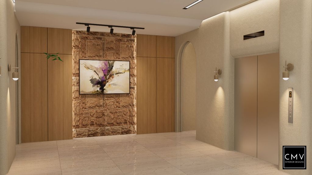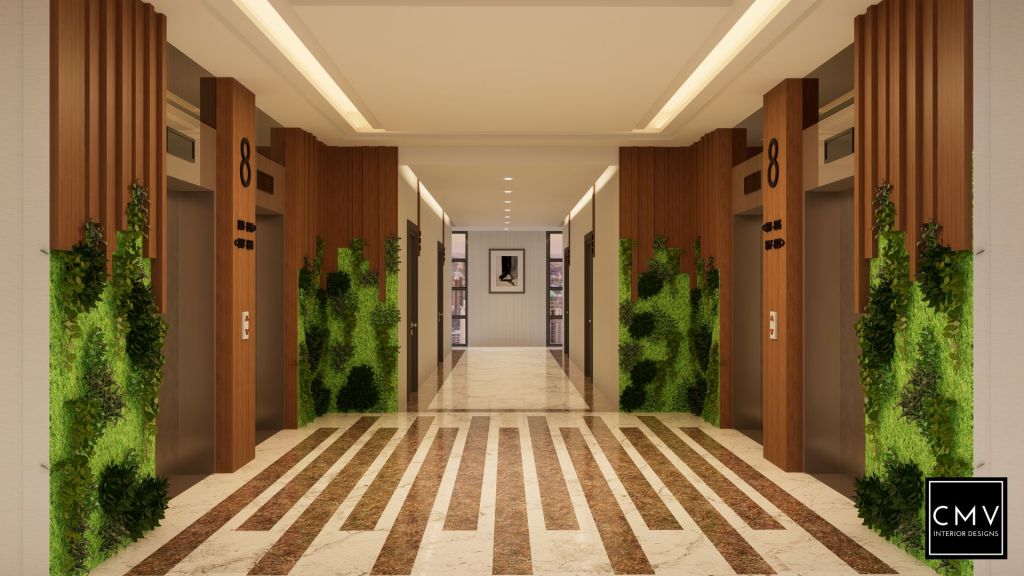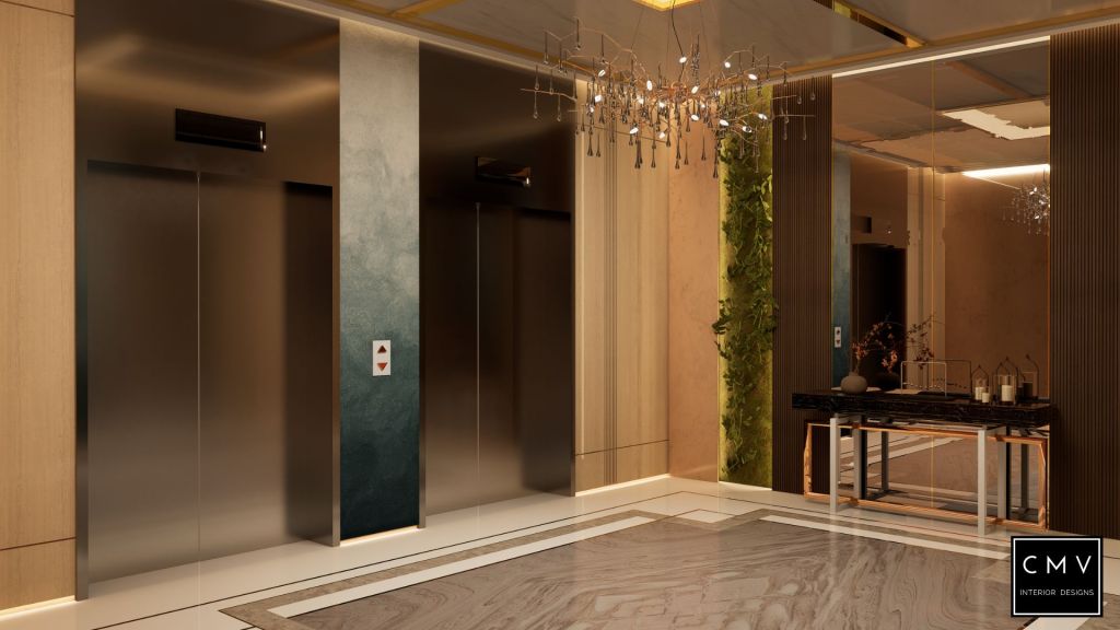 This elevator lobby presents a harmonious blend of opulence and organic design. The space is anchored by rich stone flooring featuring a symmetrical bookmatched pattern that draws the eye toward the feature wall. Vertical green wall panels introduce a refreshing biophilic touch, balanced by textured wall finishes in warm beige and wood tones.