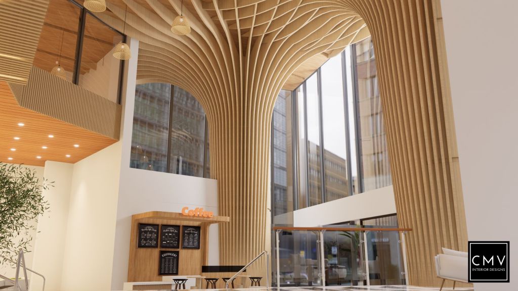 The wooden slats flow across the ceiling and walls in a rhythmic, wave-like pattern, creating a visual rhythm that naturally draws the eye through the space. These smooth curves soften the structured space and give it a sense of fluidity. The combination of warm wood tones and rhythmic curves makes the space more welcoming, inspires creativity, and invites openness.