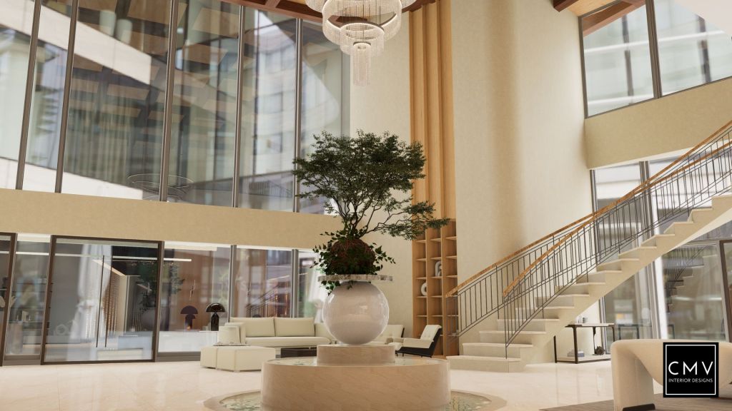 This modern lobby interior blends elegance with natural elements, creating a serene and luxurious atmosphere. The space features soaring ceilings, expansive floor-to-ceiling windows that flood the room with natural light, and a striking central tree sculpture planted in a glossy white orb atop a circular fountain. The neutral-toned furniture, minimalist decor, and refined architectural lines—including a graceful staircase with wood-accented railings—enhance the overall sophistication. Crystal chandeliers add a touch of glamor, perfectly complementing the earthy tones and natural textures.
