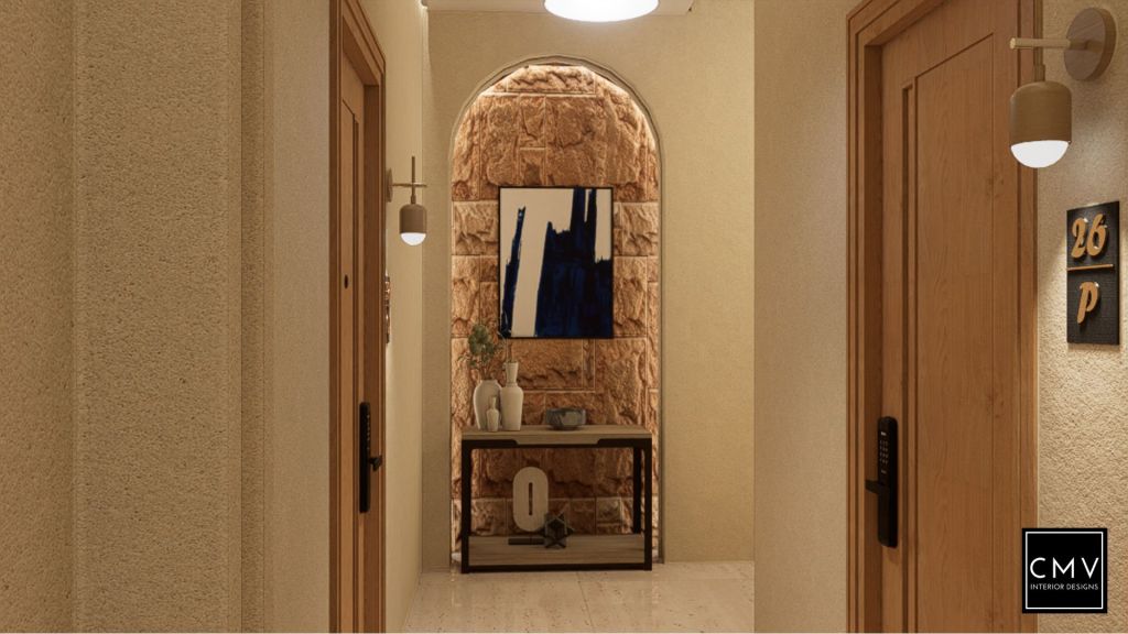 The rough-looking surface contrast beautifully with the polished marble flooring, sleek designs, and modern furniture, creating an elegant and harmonious balance. The textured feature wall brings depth and sophistication to the space and enhances visual interest, comfort, and inviting. Every element flows seamlessly, turning every corner into a masterpiece of sculpted elegance.