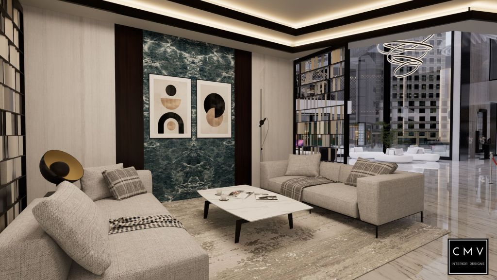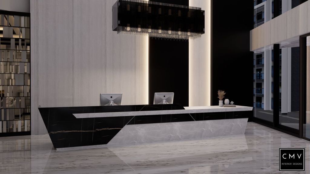 This reception area is a bold yet refined expression of contemporary luxury. The angular reception desk is crafted with a sleek combination of black and white marble finishes, giving it a commanding presence and architectural flair. The vertical backdrop is emphasized by contrasting light and dark panels, with integrated linear lighting that adds depth and drama to the space. A suspended modern chandelier made of black glass and fine metallic elements adds a touch of opulence. The use of high-gloss marble flooring reflects the surrounding elements, amplifying the sense of space and light. Floor-to-ceiling windows bring in natural light while connecting the sleek interior to the urban exterior view.