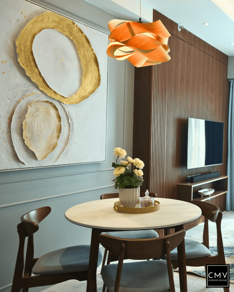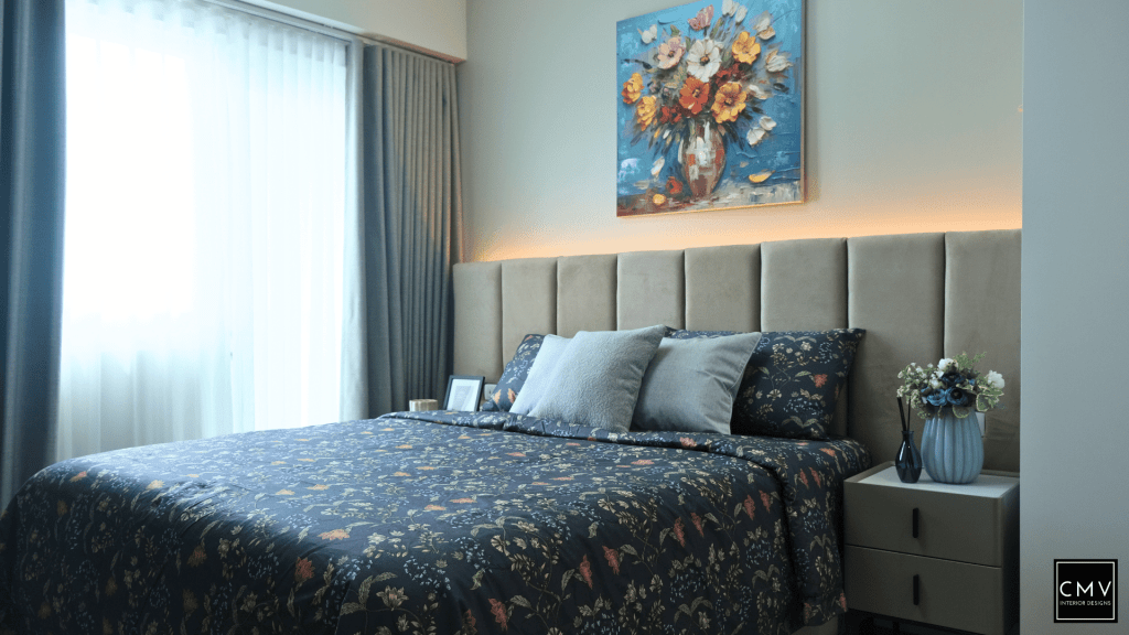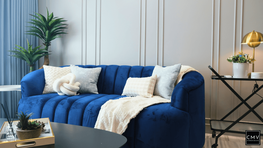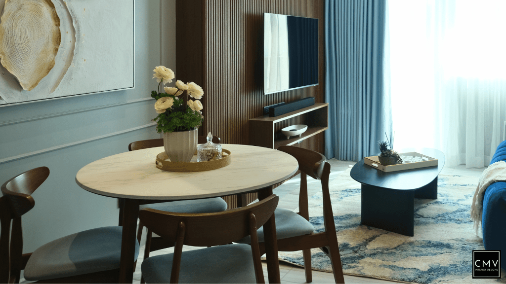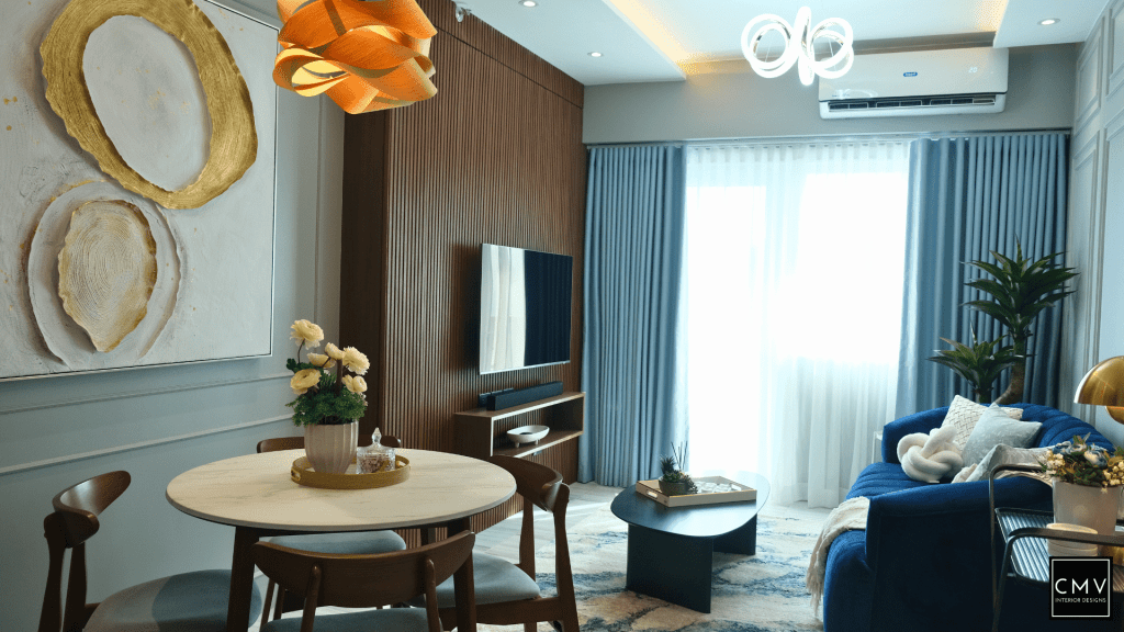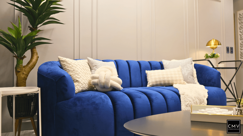 This newly completed Maven condo unit in Pasig City features a cozy yet contemporary interior — elevated by natural textures, layered lighting, and a striking blue sofa as the focal point.”