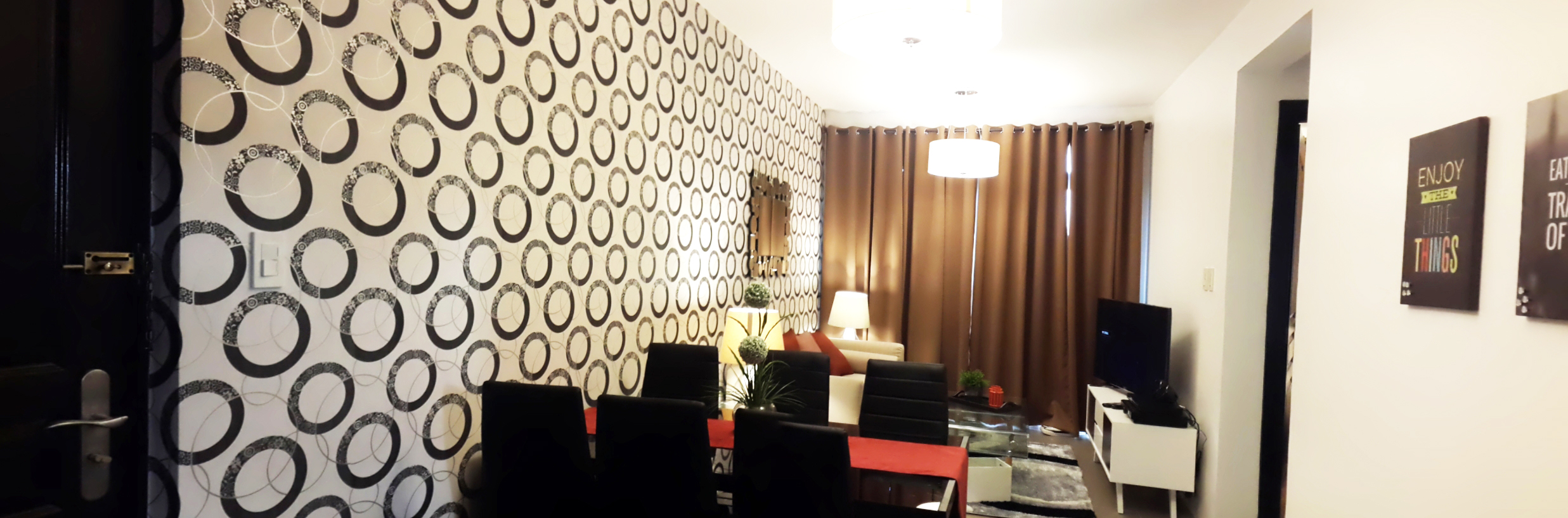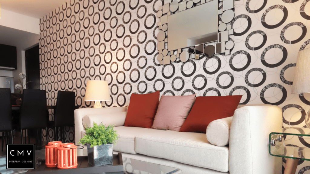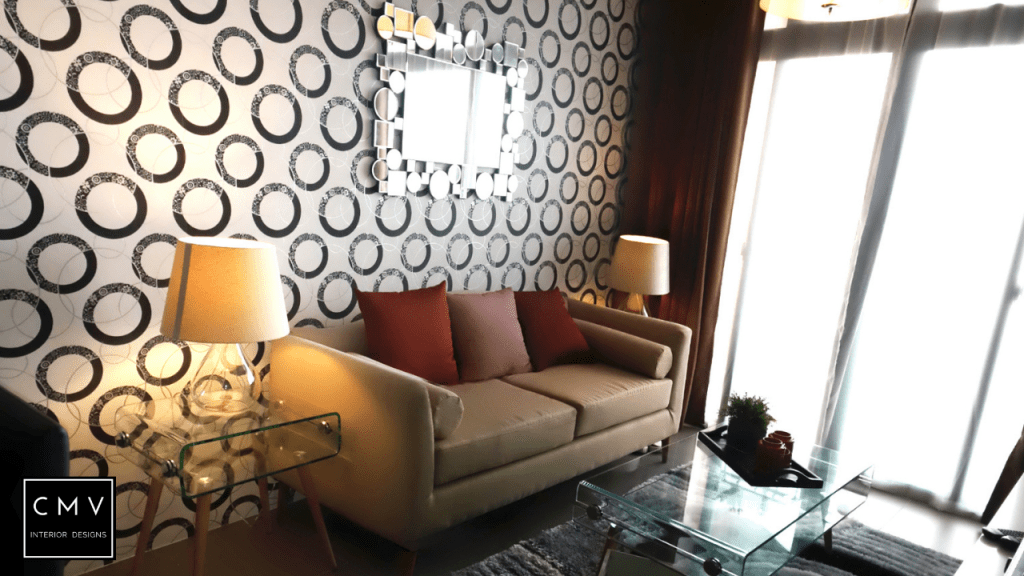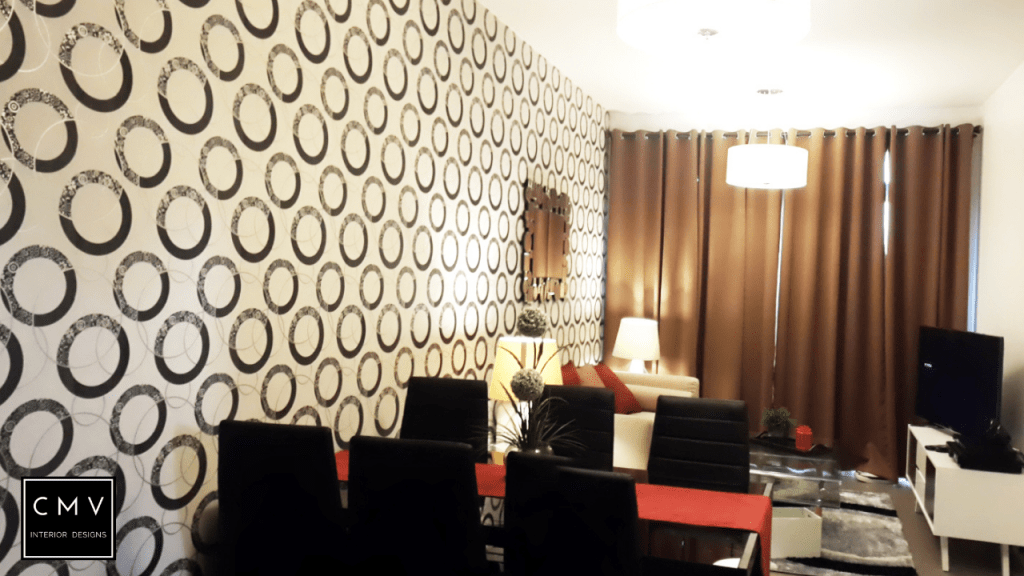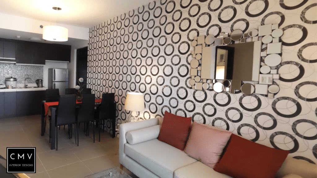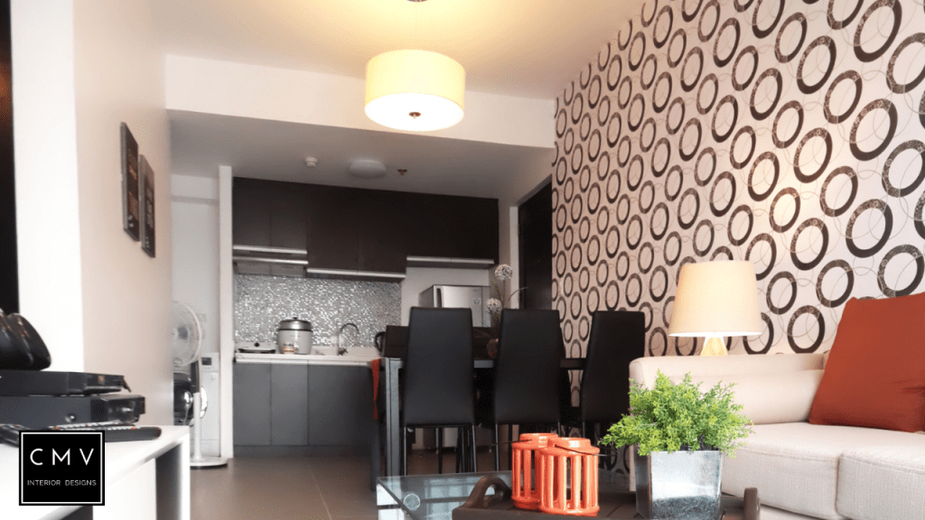 “In this video, we will show you how we designed this bare condo unit located at Cubao Quezon City. For this project, we used wallpaper for an accent wall with circular patterns and red accent pillows for the sofa. Inspired by the lifestyle of our client in Dublin Ireland. Lively and serene. The Dublin lifestyle portrays eclectic, quirky, and colorful interiors and executes with the utmost of style that makes a modern home. Just like the color scheme combination, orange is a mix of the energy of red with the happiness of yellow to create enthusiasm, resulting in a vibrant hue. It is a sense of luxury that’s understated and promotes a calm atmosphere. A circle symbolizes harmony and unity where it leaves an impressive outline toward the wall in the living area.”