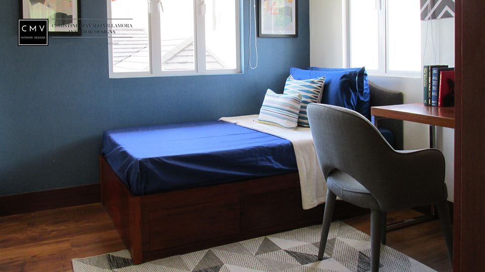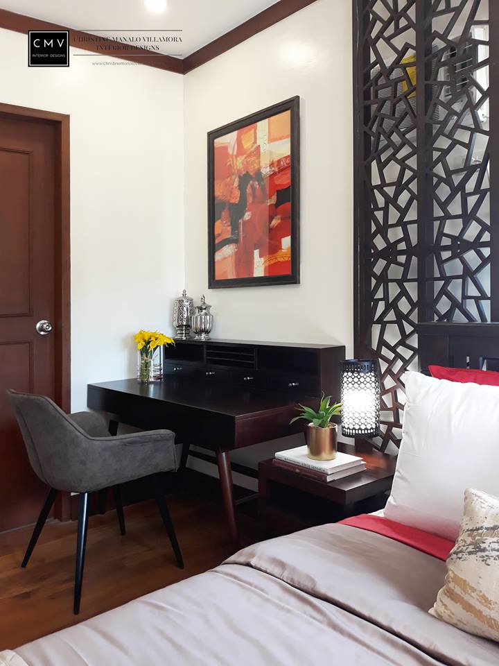 “We want to create a statement wall on the headboard side and at the same time, we cover the existing location of the aircon without blocking the airflow. We came up with a solution and wall panel design that will allow the airflow to circulate. The wood stain and finish of the wall panel match the headboard, desk, and chair to create a cohesive look.”