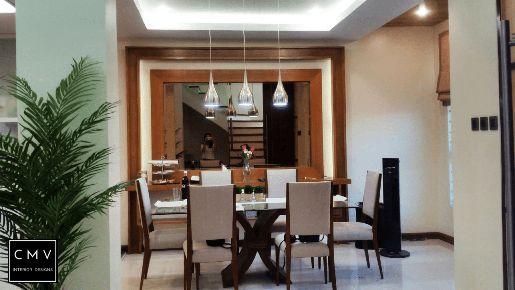 “A Residential Project Located in Doña Manuela Subdivision in Las Piñas City. On this project, the homeowner already has a wood accent on the living room wall. From there and considering the architectural features of the home, we came up with a design that will mediate the environment and not against it. For the accent pieces like in the living room, we were inspired by the color combination found in the artwork. Red, yellow, dark brown to black from the artwork were reflected in the pillow cover, floral arrangement, and other home accessories.”